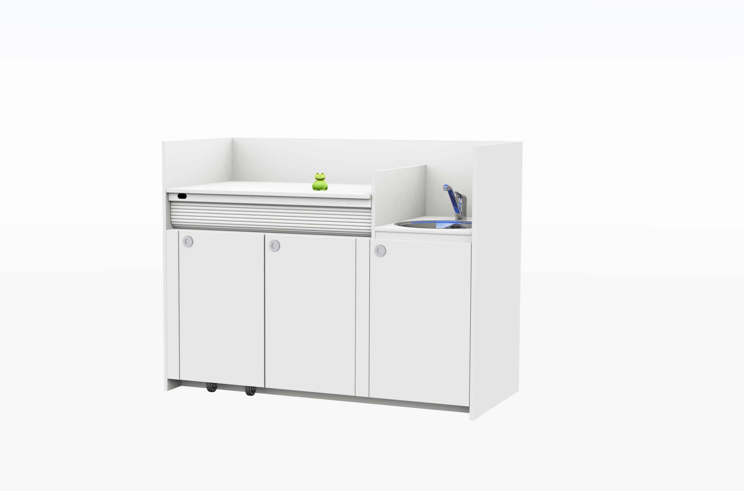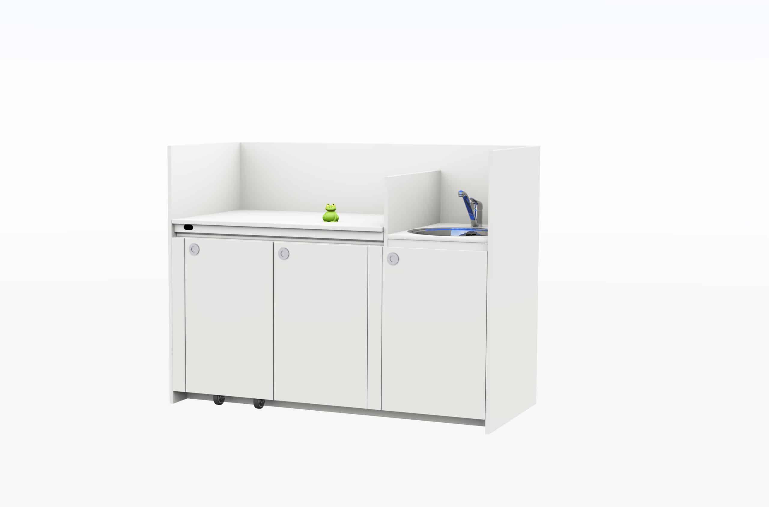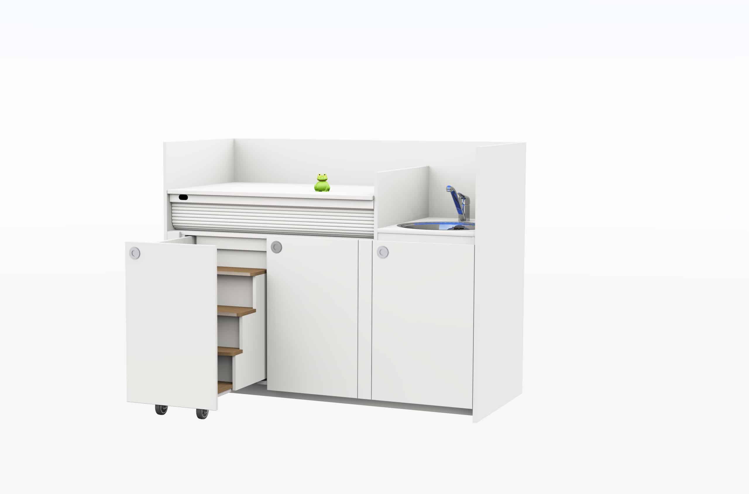 Deze praktische commode is ontworpen met oog voor comfort, veiligheid en ergonomie. Het werkblad is in hoogte verstelbaar tot 105 cm en voorzien van een vaste spoelbak – ideaal voor een rugvriendelijke werkhouding. Een slimme extra is het geïntegreerde trapje in de kast, waarmee oudere kinderen zelfstandig naar boven kunnen klimmen (onder toezicht).